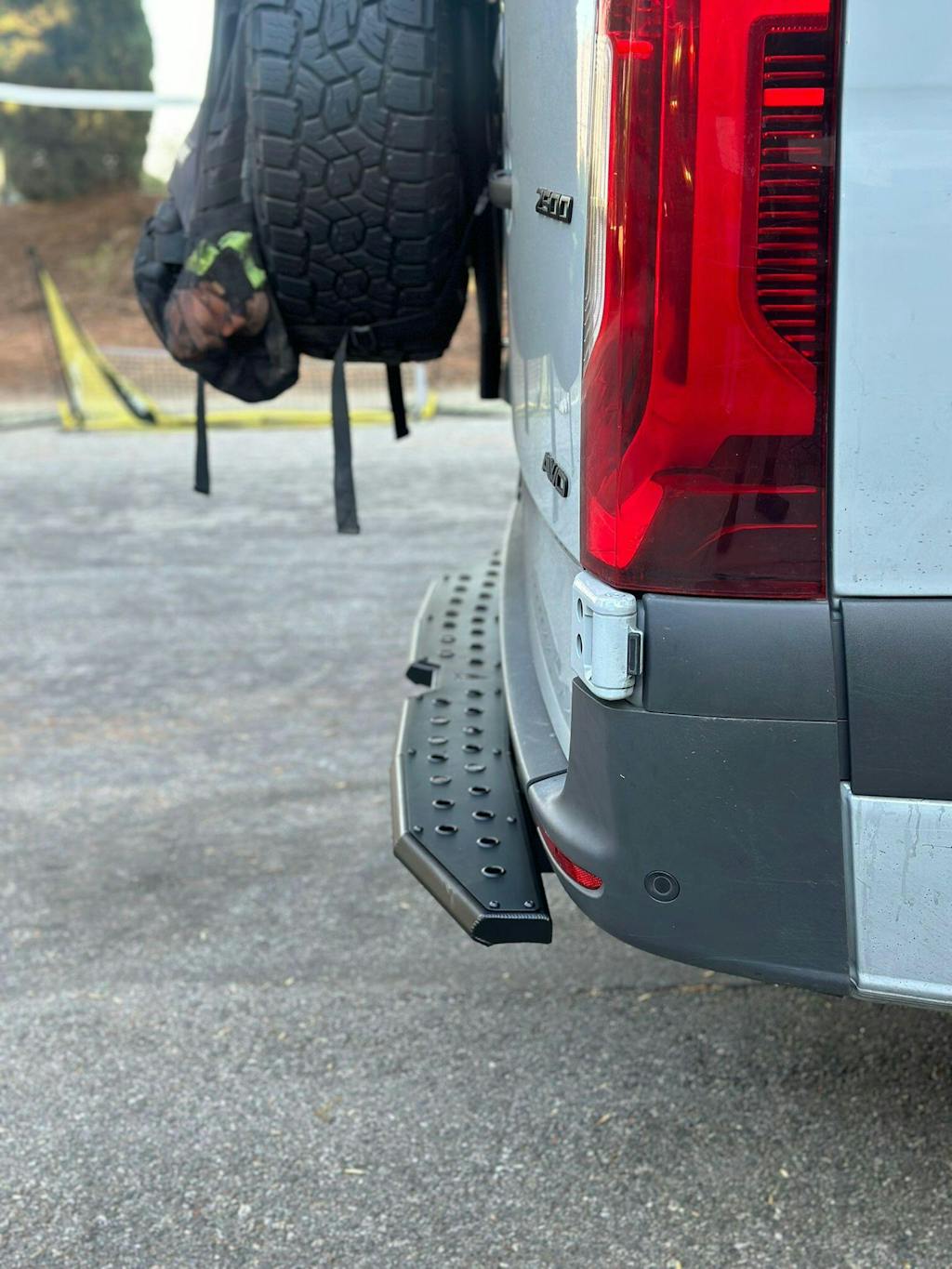 The Sprinter Rear Plate Step has formed dimples in the aluminum plate for traction. After years of R&D in the rain, snow, dust, and mud in the PNW, we think this is the perfect amount of traction that doesn’t sacrifice looks or function.