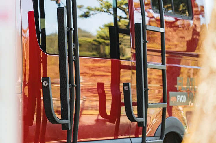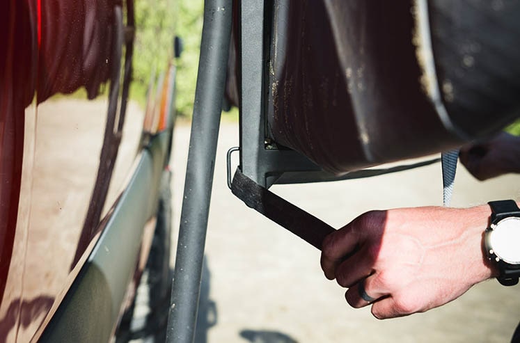 The hooks fold parallel to the van for easy storage and are equipped with billet aluminum clamps and plastic bushings for smooth rotation in all weather conditions.