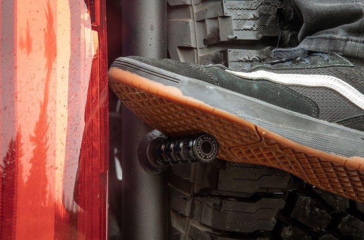 The design incorporates dimpled cutouts in the steps and machined aluminum foot pegs, ensuring an enhanced grip and added convenience when accessing the van's roof.