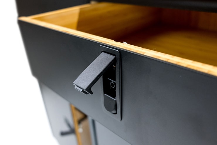 With a powder-coated aluminum frame and a heavy-duty 1-3/8" bamboo top, our galleys are built to last the lifetime of your van. And with push-lock buttons, the drawers and cupboard door stay closed even when the ride gets bumpy.
