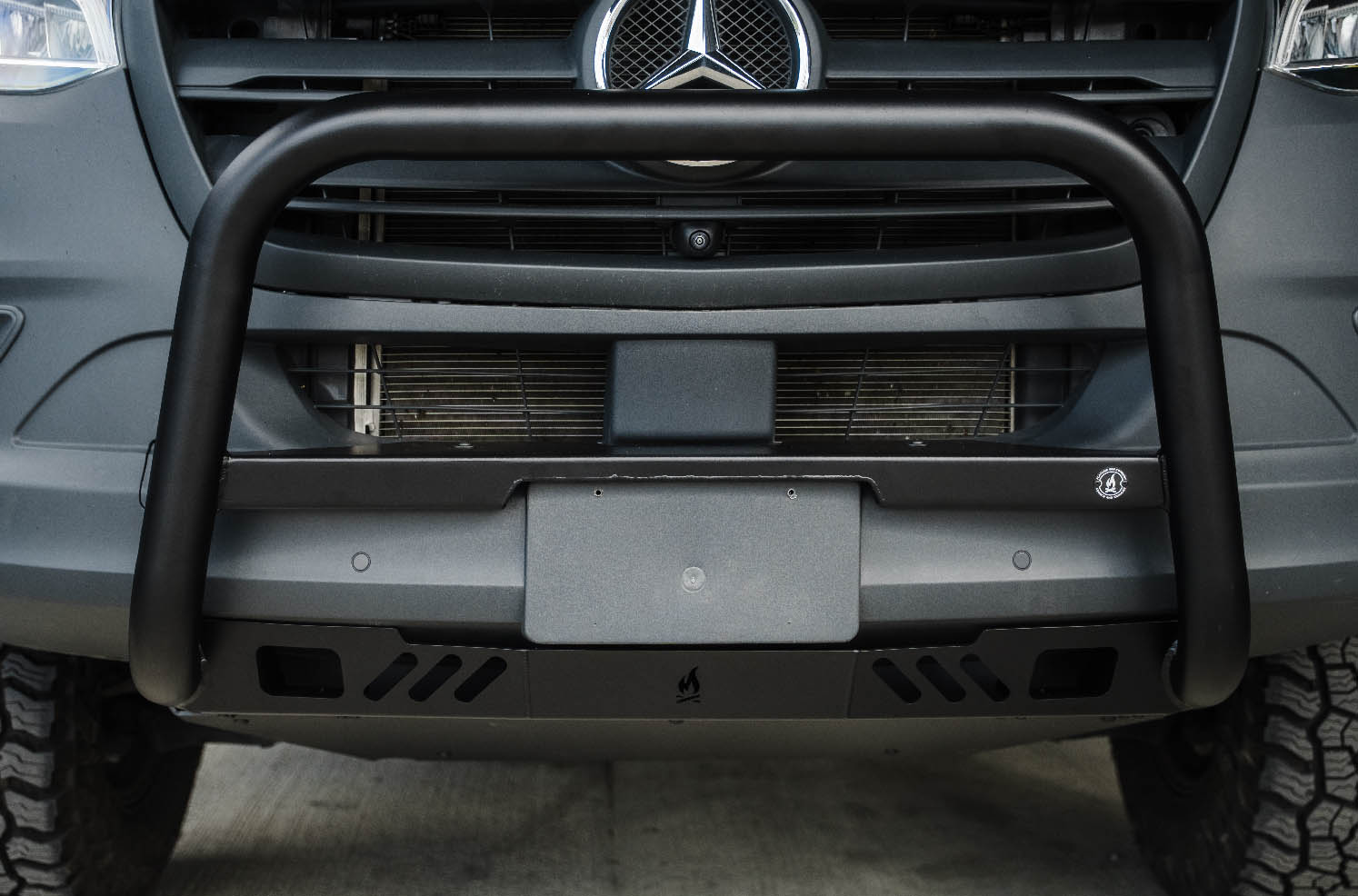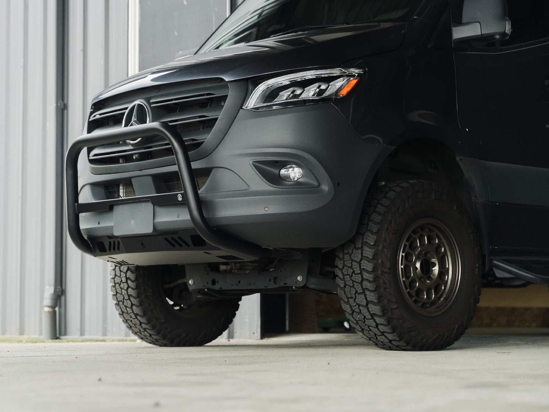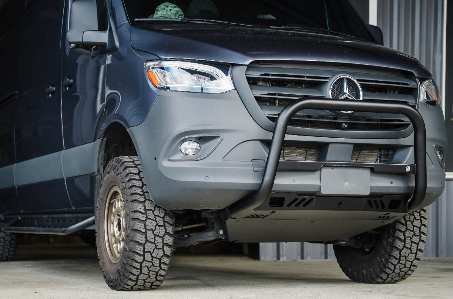 The Sprinter Bull Bar adds an aggressive, purposeful look to your van’s front end while delivering real off-road functionality. It adds front-end style while opening up serious auxiliary lighting options, there’s no cutting or drilling required for installation, and it pairs directly with our Sprinter Skid Plate for complete front-end coverage.