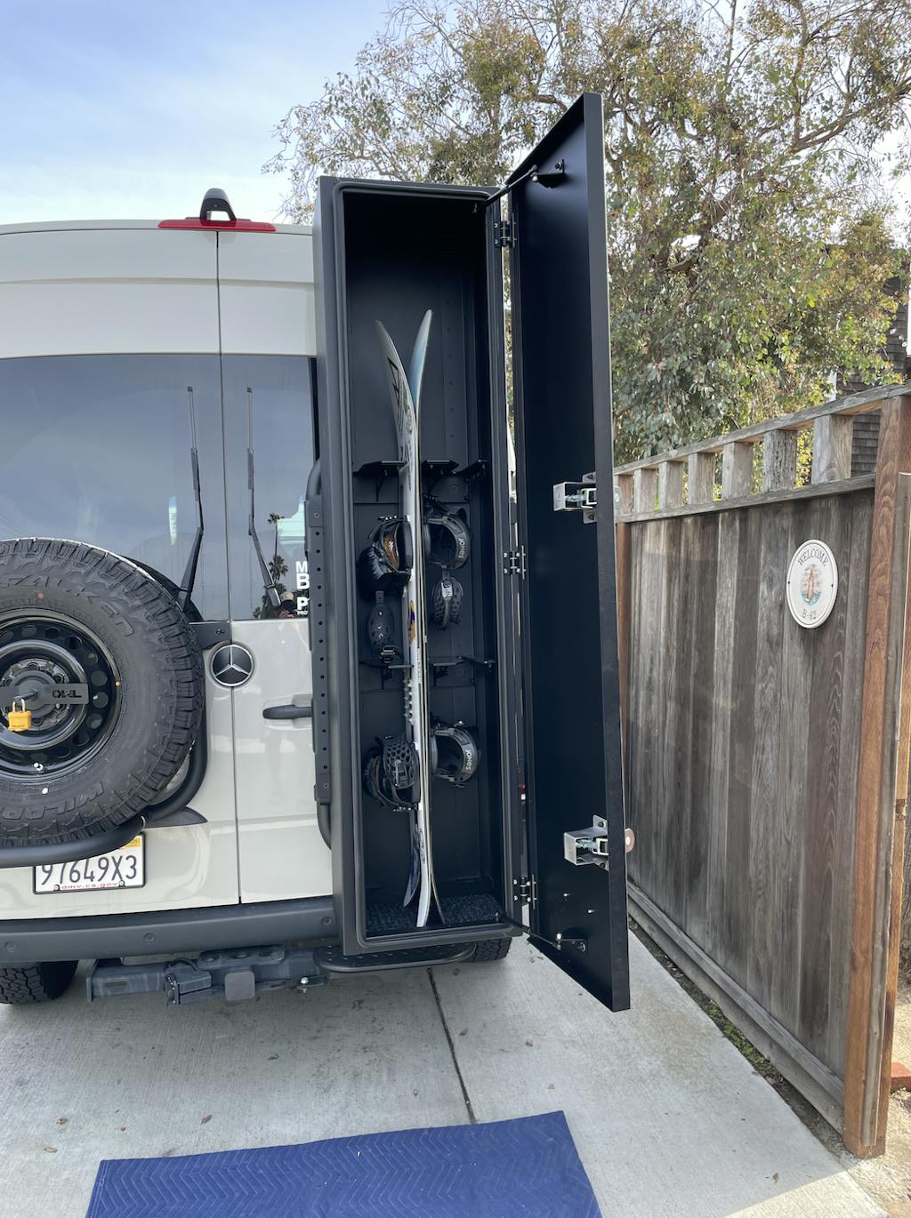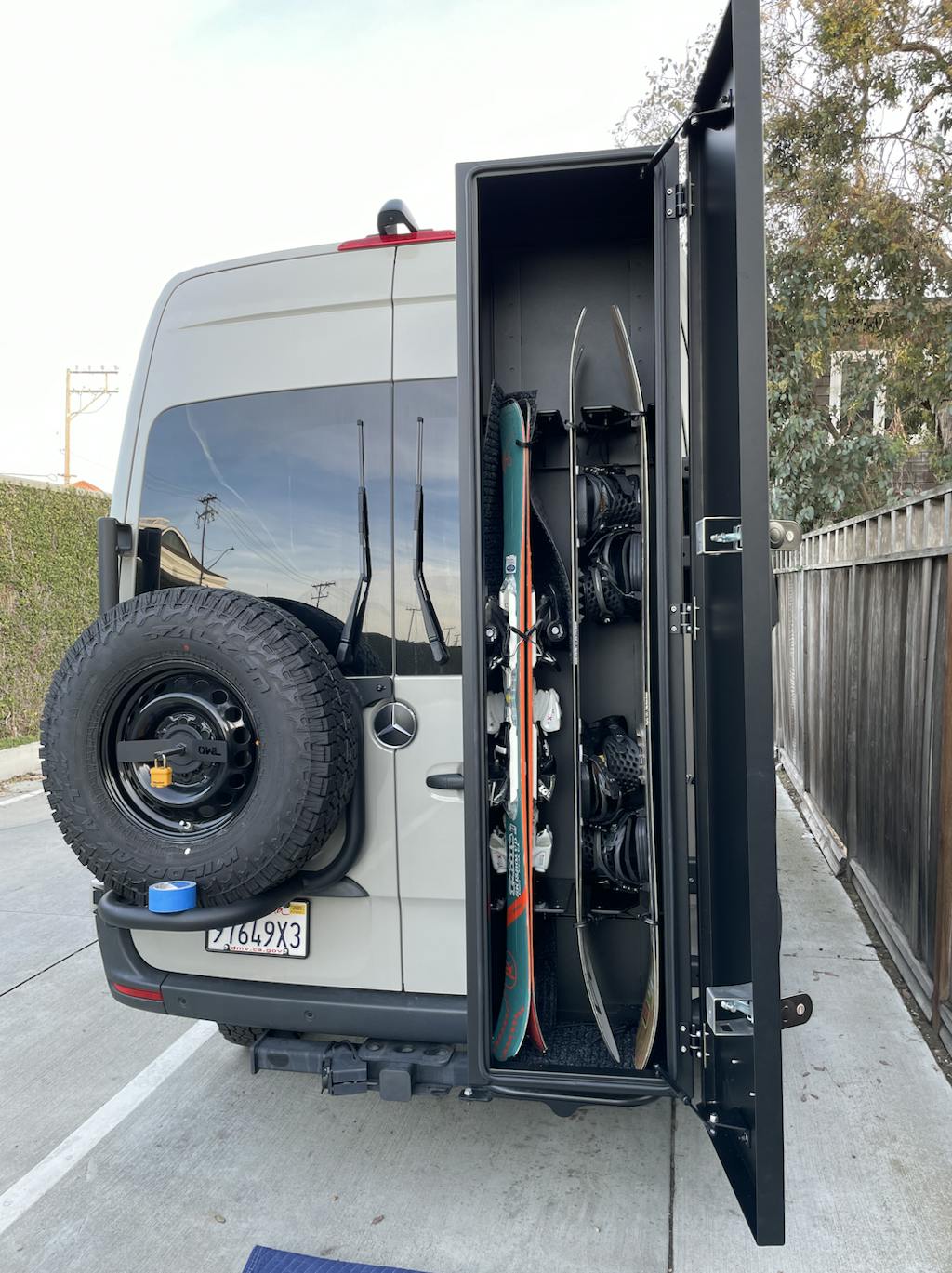 After looking into the various ski boxes on the market, I narrowed my decision to the Flatline Ski Box and the Owl Alpine Box. I chose the Flatline box as I felt the proportions of the Owl box were too large on the back of a Sprinter (I also don't need to carry 205 skis). My rear door carrier is an Owl B2 Classic and as such, I needed to use the Flatline B2 brackets to mount the ski box (more on this later). I spaced the brackets so my mounting holes would be placed 30" apart. This spacing required that I drill two new mounting holes in the ski box. Mounting the brackets to the B2 and getting the Ski Box on the brackets was easy enough.