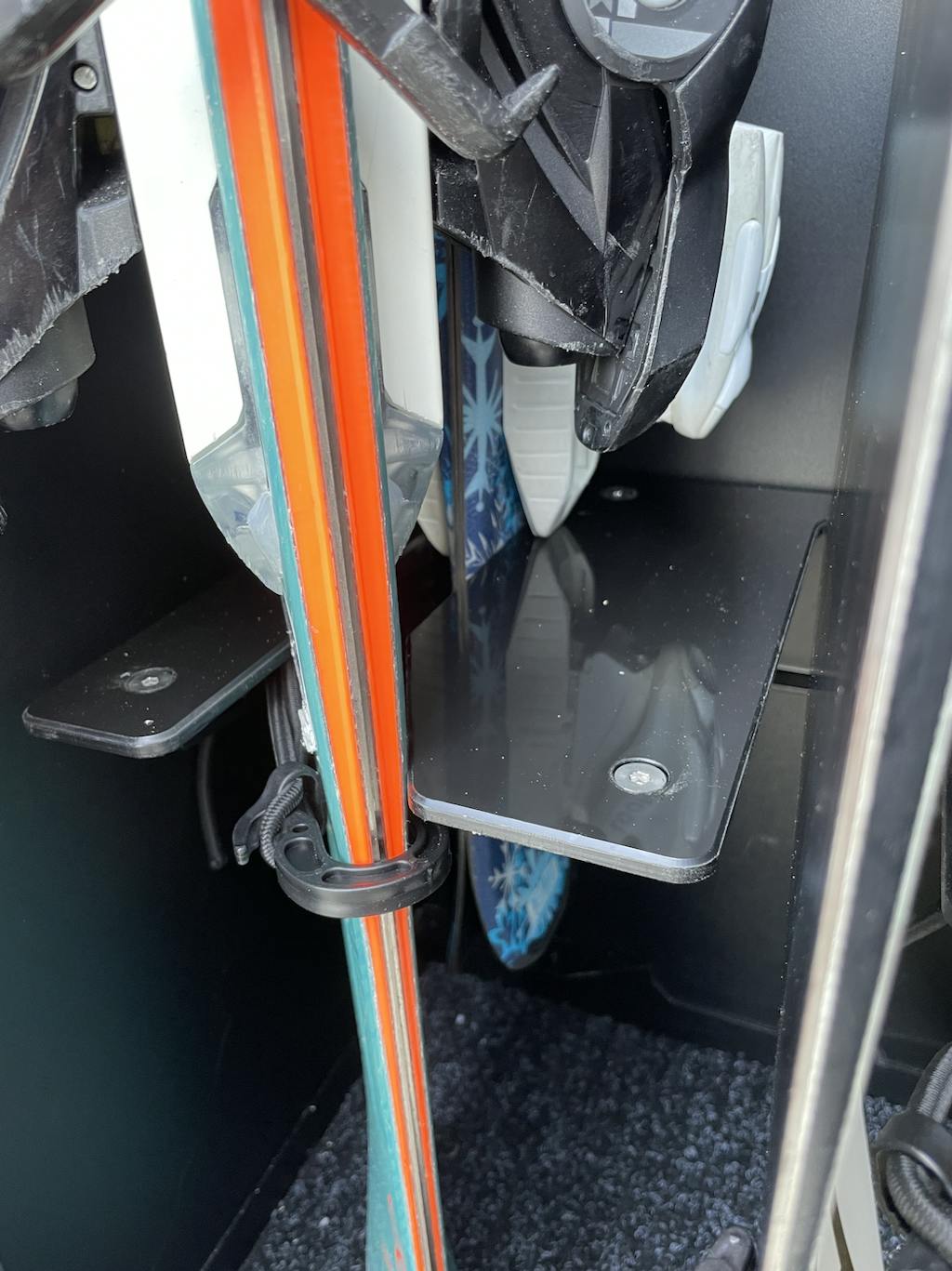 After puzzling with it for well over an hour, trying various holder heights and board/ski positions, I eventually figured out a way to get everything inside and adequately spaced without any rubbing. The various attached pictures show some of my other attempts.